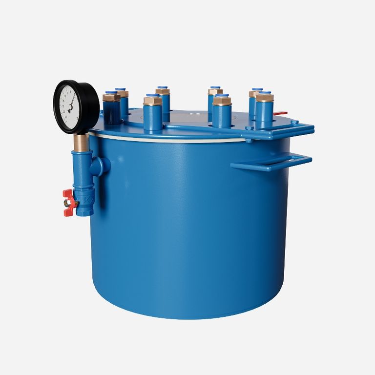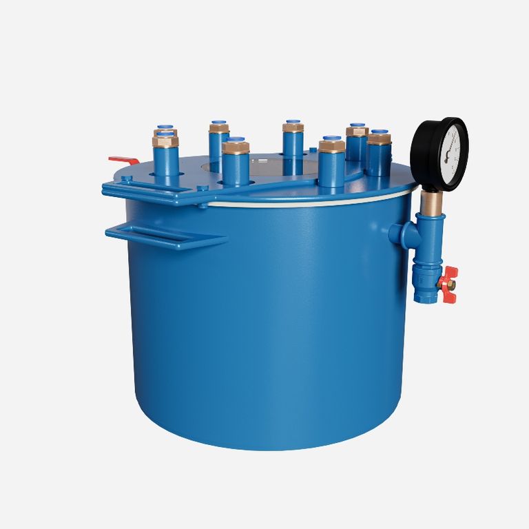 Данная вакуумная камера предназначена для улавливания избытков смолы во время процесса формования методом пропитки под вакуумом (VARTM, Вакуумная инфузия). Множество подключений к вакуумной ловушке для смолы позволяет проводить множество инфузий одновременно. Система оборудована быстроразъемными соединениями для удобства и быстроты подключения.Вакуумный резервуар можно использовать в качестве дегазатора (вакуумной камеры) для удаления воздушных пузырьков в смеси силикона или смолы перед заливкой в форму.